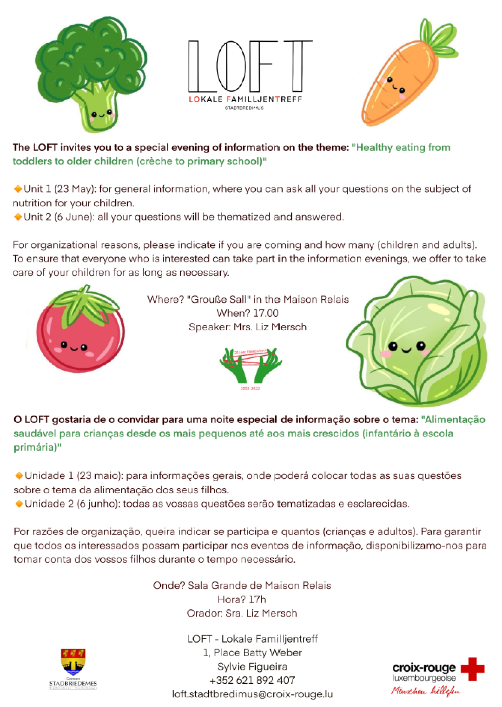 Mir freeën eis iech 2 nei interessant Evenementer vum Loft kënne firzestellen : souwuel de 5te Mee wéi och den 22te Juni kritt dir gewise wéi dir iech mat Klangschuelen entspane kënnt fir als Eltere méi ausgeglach ze si. Duerno, de 23te Mee an de 6te Juni, fënnt en Infoowend zum Thema "Gesond Ernärung fir Kleng a Grouss" statt.