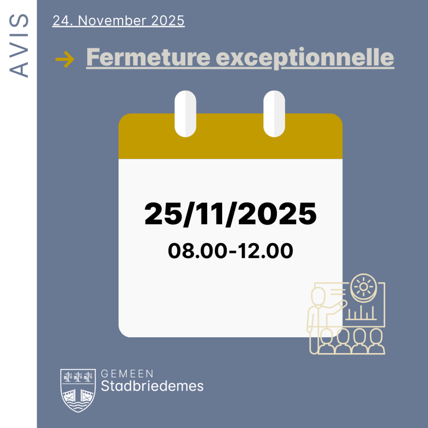 En Dënschdeg, 25.11.2025 ass d’Gemeng vun 08:00 bis 12:00 Auer wéinst enger Formatioun vun eise Mataarbechter zou.