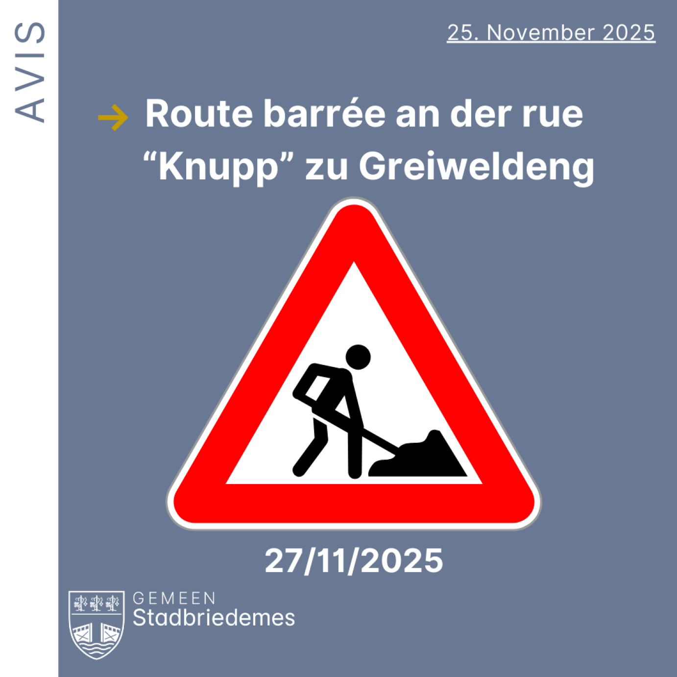 En raison de travaux dans la "rue Knupp" à Greiveldange, la route sera fermée le jeudi 27 novembre 2025 de 8h30 à 16h00 entre les maisons n°20 et n°22. La circulation sera impossible dans les deux sens pendant cette période. À partir de 16h00, la route sera rouverte, mais la circulation sera régulée par des feux rouges jusqu’au 5 décembre 2025. Merci pour votre compréhension