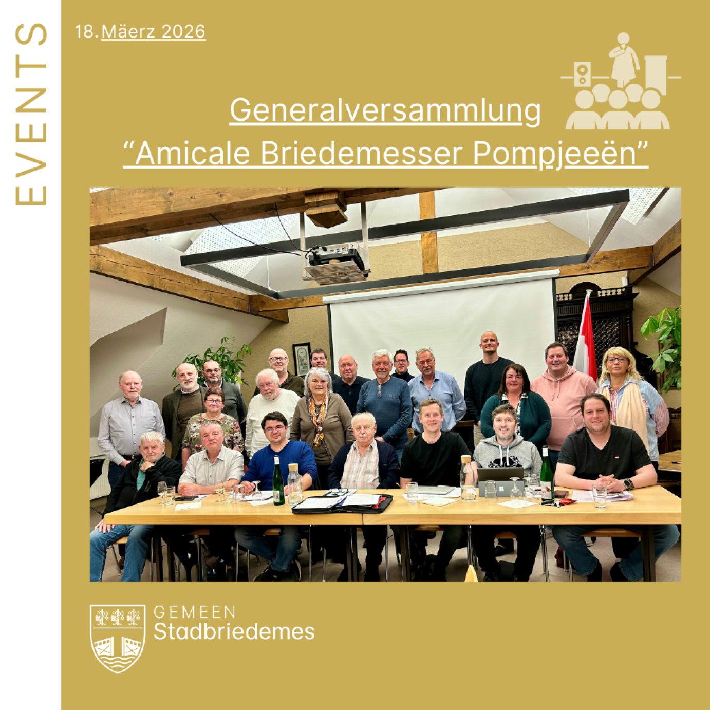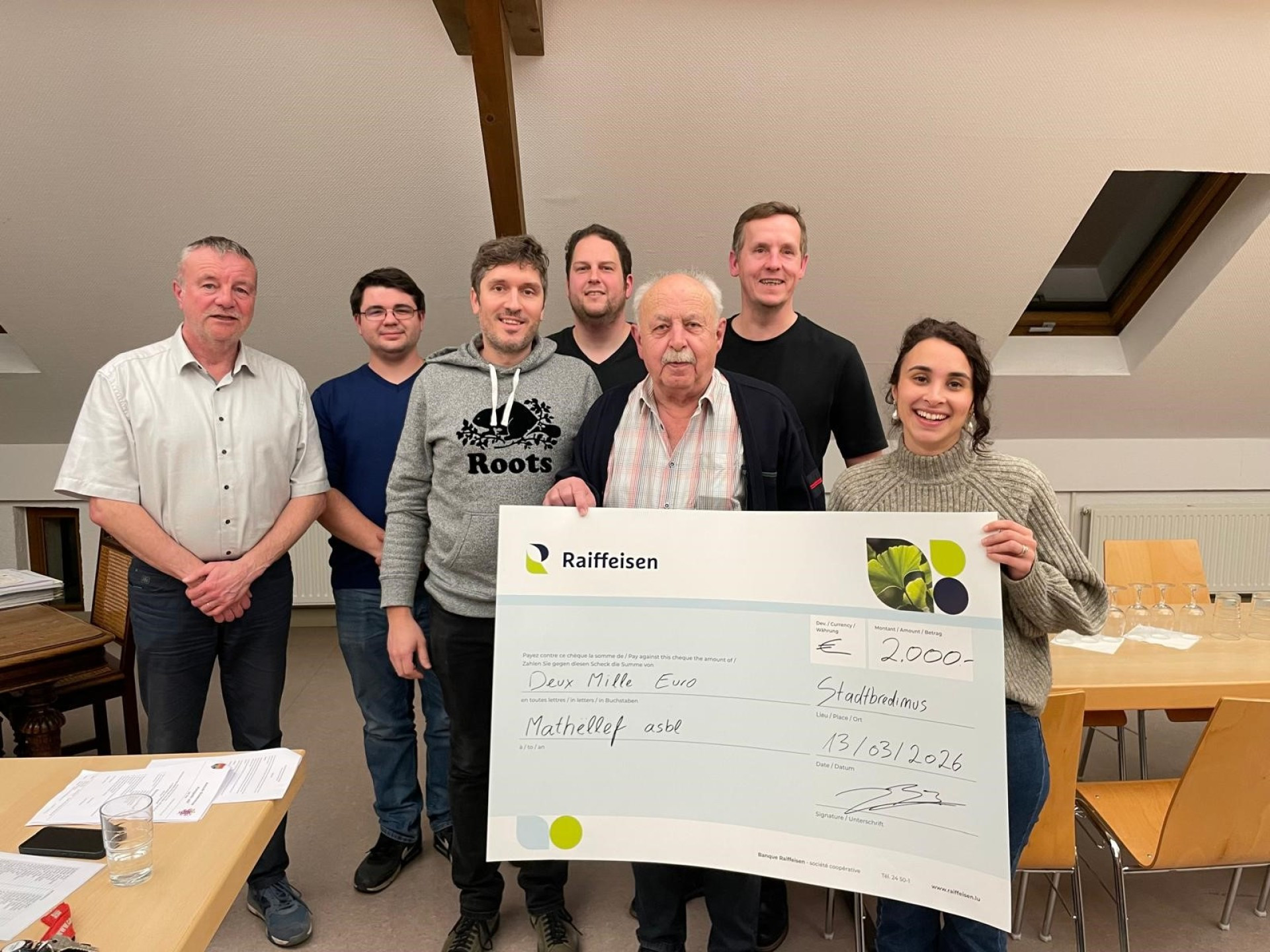 Um Freideg, den 13. Mäerz 2026, huet d’Amicale Briedemesser Pomjeeën hir alljährlech Generalversammlung am Gemengesall ofgehalen. Bravo un d’Membere vun der Amicale fir hiren generéisen Don vun 2.000 €, deen si un d’Associatioun "Mathëllef a.s.b.l." iwwerreecht hunn. Dësen Engagement weist mol erëm, wéi staark de Solidaritéitssënn an eiser Gemeng ass.